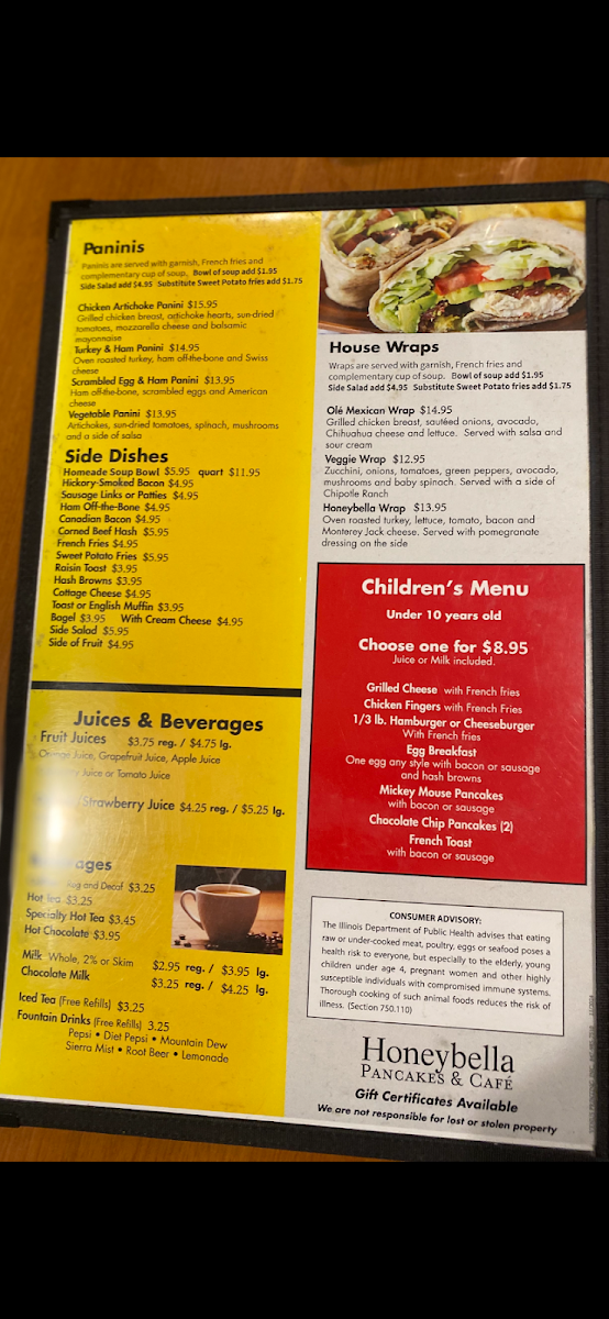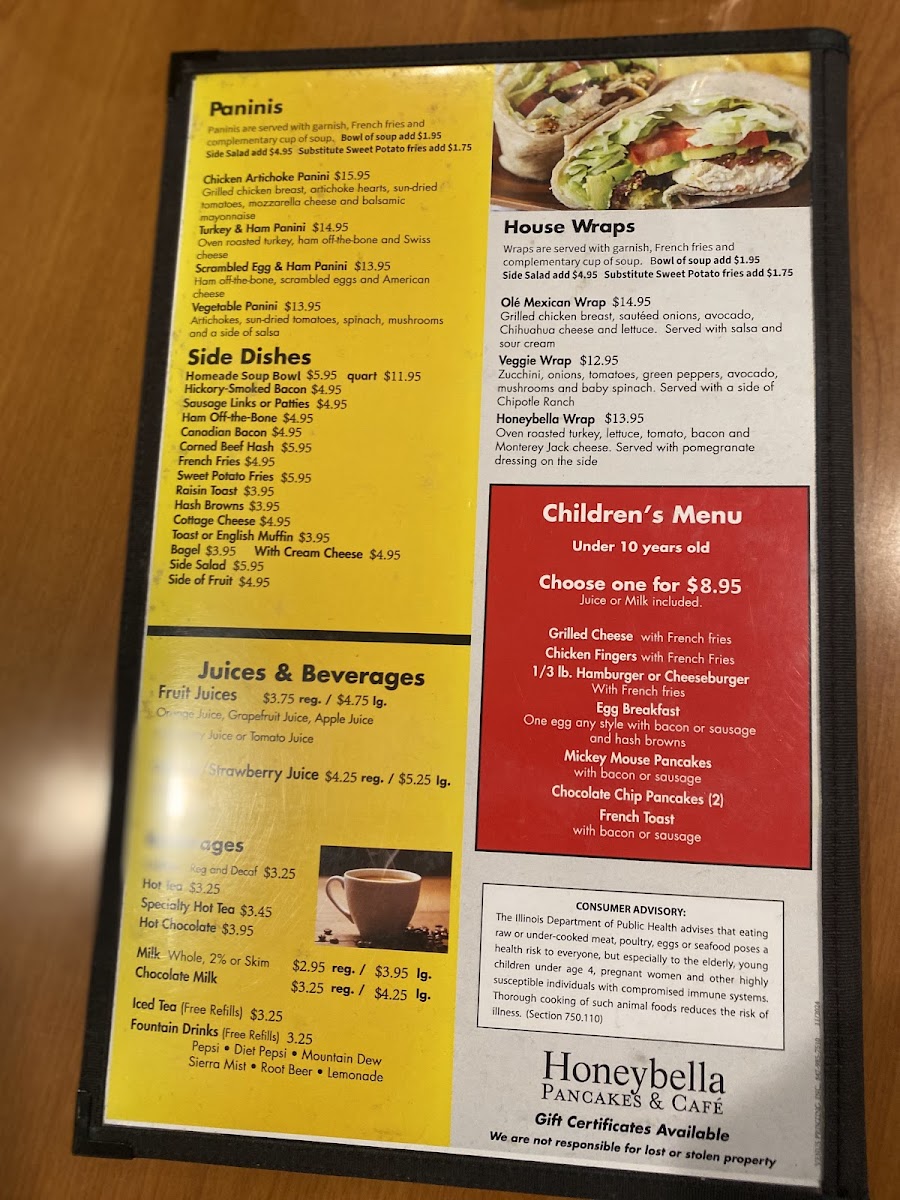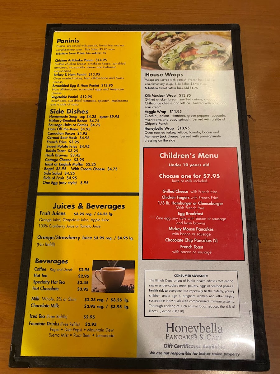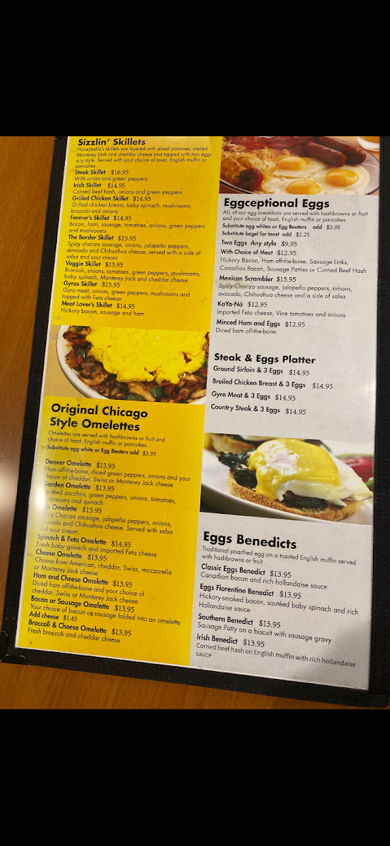 - Signature dishes such as Biscuits and Gravy or the Honeybella Wrap